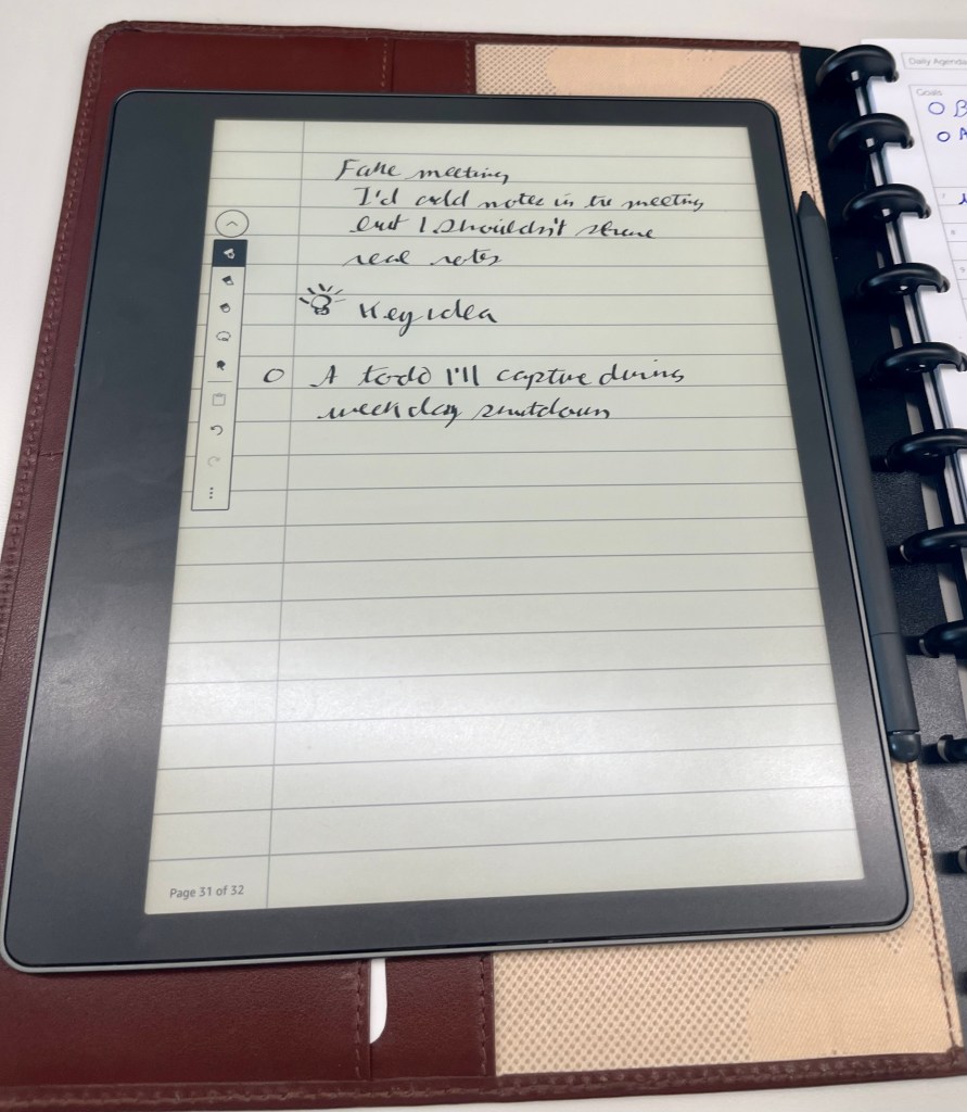 Instead, I take notes hand, currently a Kindle Scribe. This is, perhaps not suprisingly, something I used to change up fairly often – because, even thought I know it’s not true, in my heart I think a Baron Fig or a Rhodia or dot grid or a travelers journal etc. will all somehow make me more organized, and better leverage my intentions. They won’t, but I like having tools I like to use. For a few month’s, that’s been the Scribe.