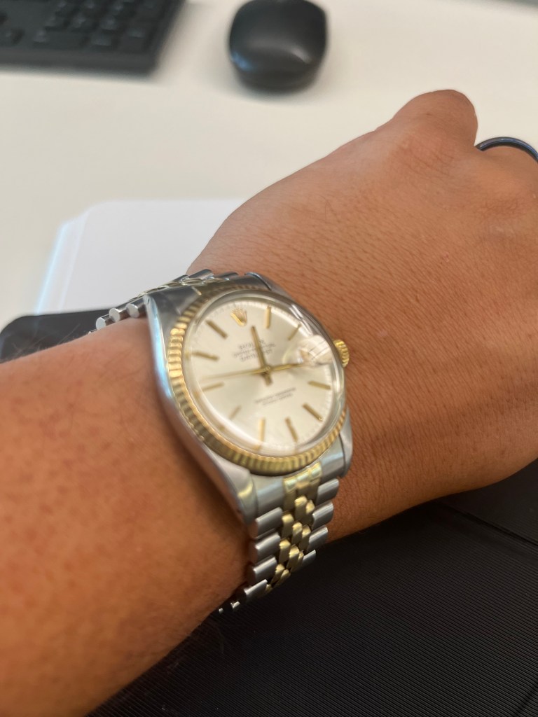 What also happened was that my dad gave me his vintage bi-metal Rolex Datejust, which he got the year I was born. I really like wearing it, and I find that it helps me visualize time more, if you tell me its 9:40, I think “its almost 10, no time to do much before that meeting, might as well mess around on the internet.” When I look at it on an analog watch, I see it as “look, there’s a third of an hour, you can do a “15 minute” task and still have space before your meeting. It just clicks more.